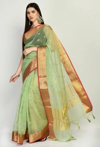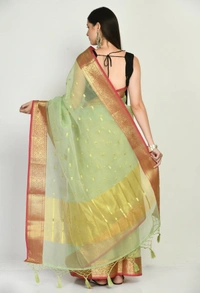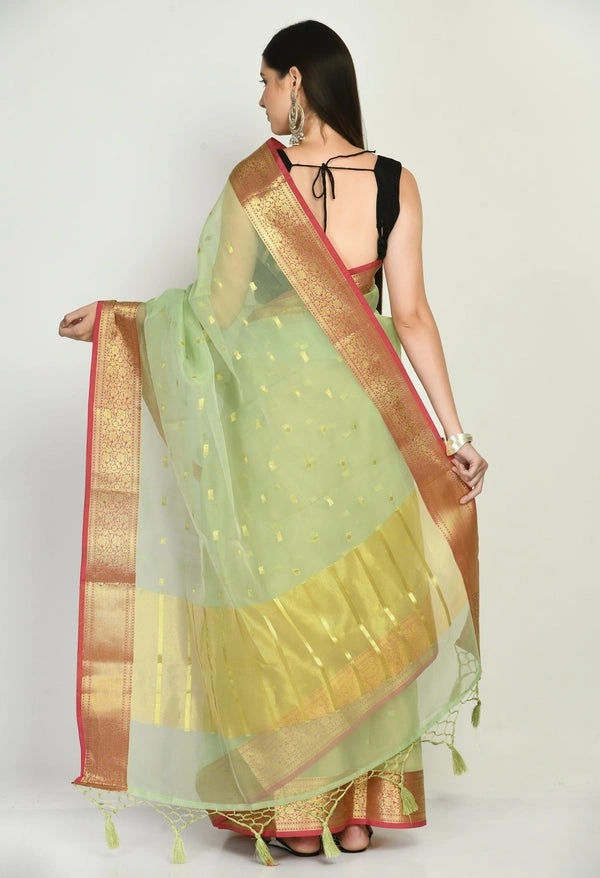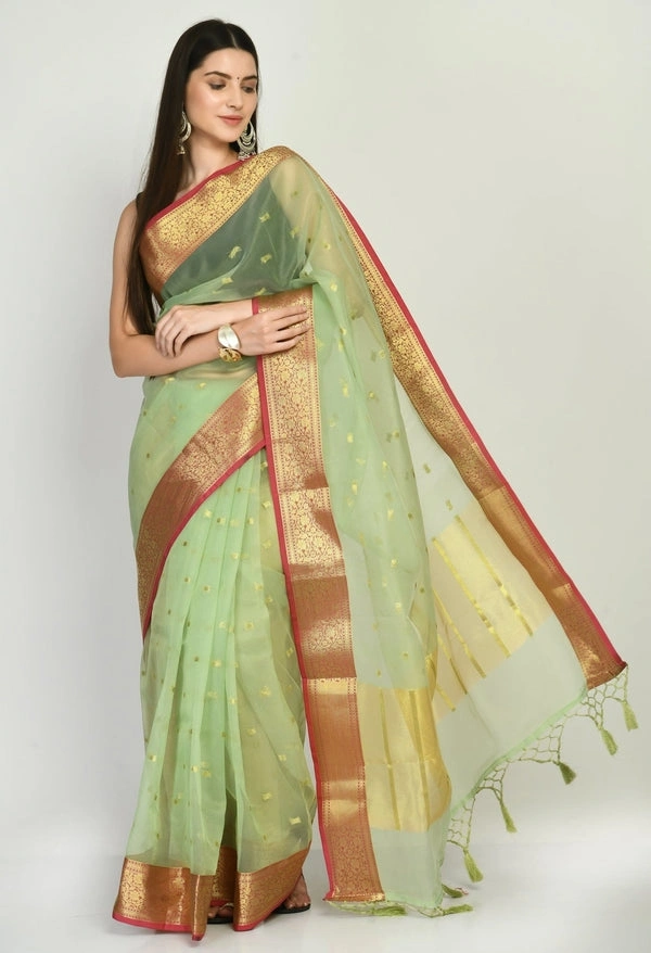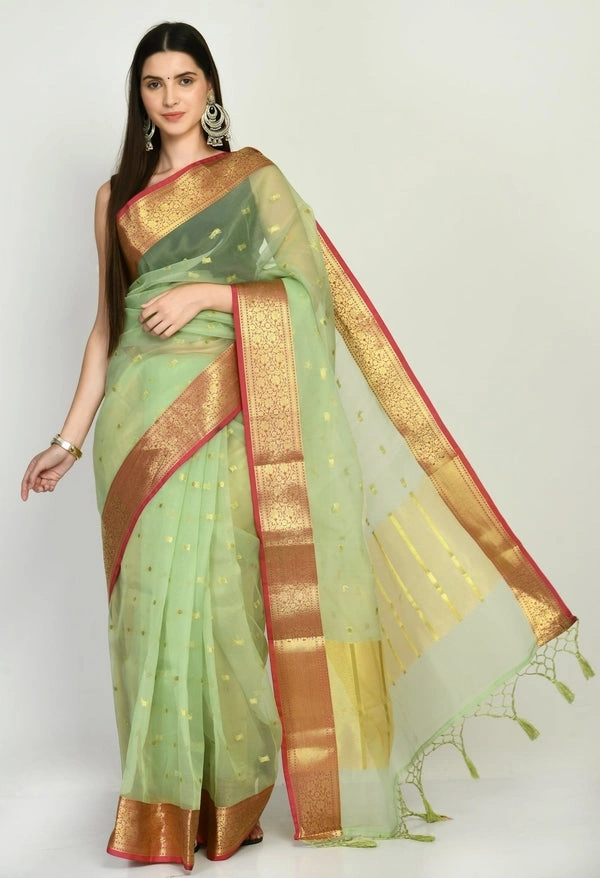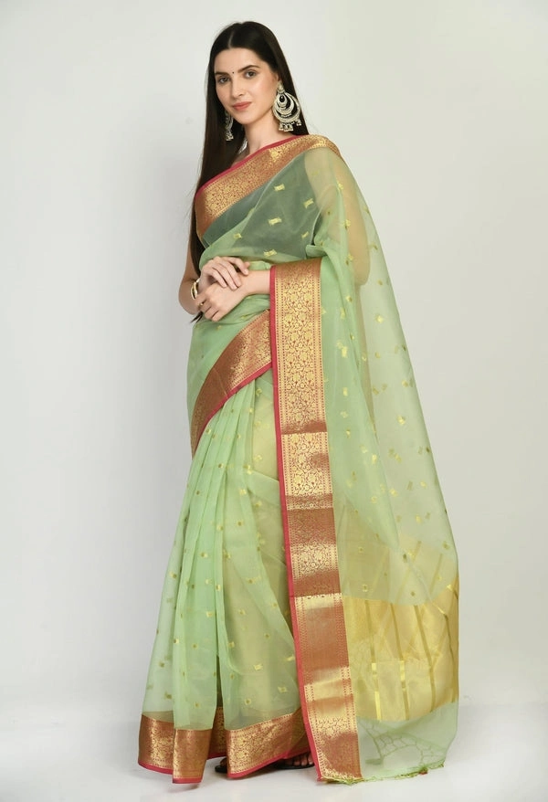 Kora Organja Saree New Chunri Buti Saree Blouse: Separate Blouse PiecePattern: Zari WovenBlouse Pattern: Same as BorderNet Quantity (N): SingleSizes: Free Size (Saree Length Size: 5.5 m, Blouse Length Size: 0.9 m)